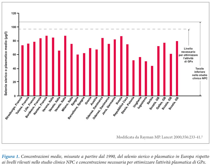 Se è ampiamente riconosciuta l'importanza del selenio per la normale funzione tiroidea e per l'omeostasi degli ormoni tiroidei,1 nell'ultimo decennio numerosi studi clinici hanno suggerito come il selenio possa avere un ruolo chiave nel mantenere il bilancio ossidativo della cellula tiroidea e nel migliorare le capacità di difesa della ghiandola anche nelle condizioni di stress ossidativo che si verificano nelle tireopatie autoimmuni (AIT). Tali studi sono stati condotti principalmente in alcune regioni europee caratterizzate da un lieve deficit del contenuto di selenio nel suolo (Figura 1).2